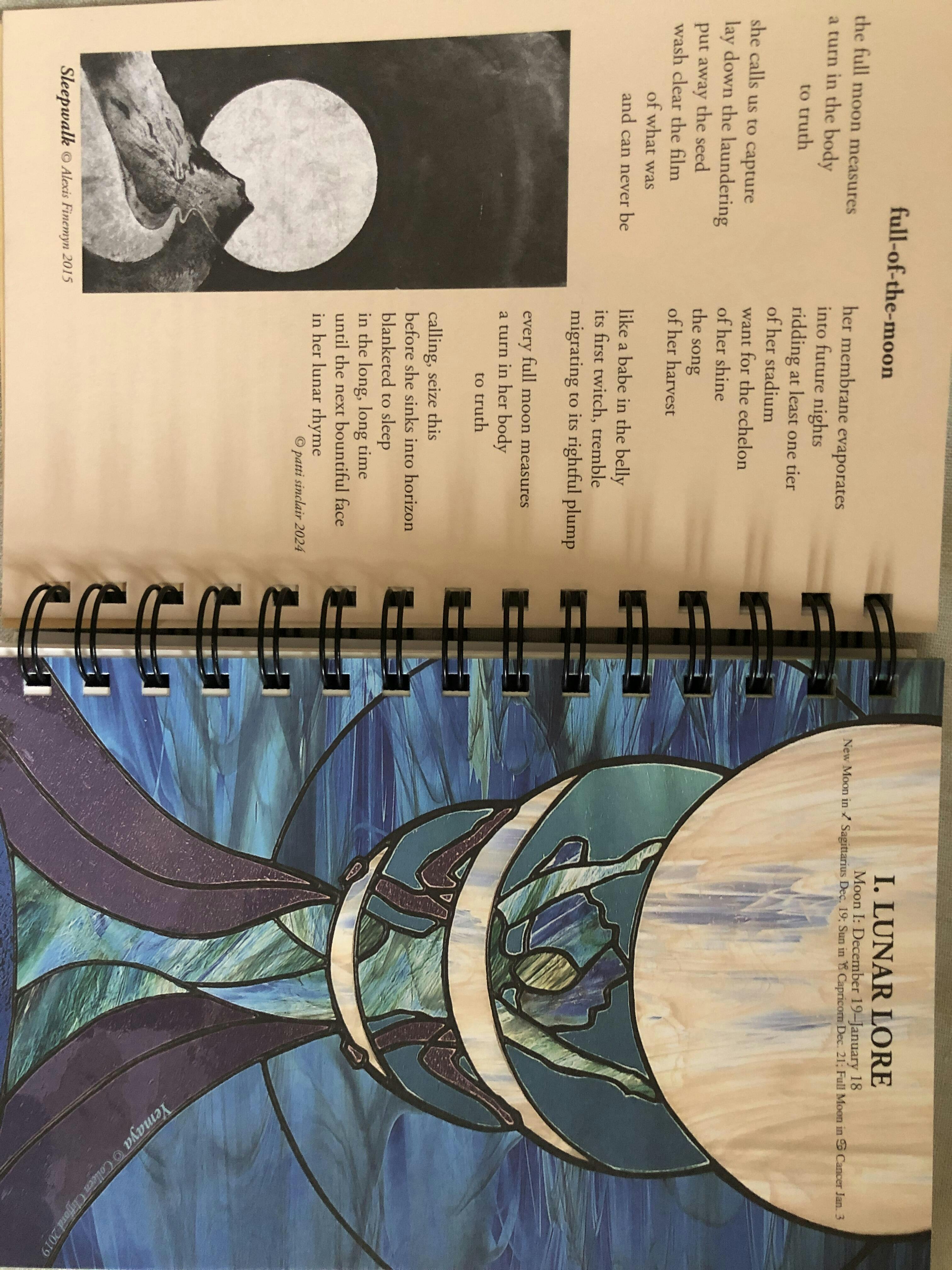 We'Moon is a small women-run organization located in the beautiful forests of Southern Oregon. The moon calendar is truly a community endevor, bringing in opinions from around the globe with our Selection Circles to help us choose from over 3,000 submissions that we receive from all over the world. Learn more about how to submit your art, poetry and writing HERE!